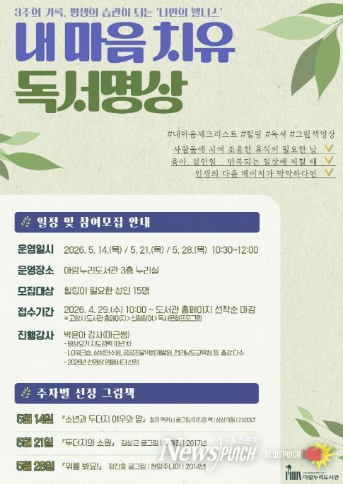 뉴스펀치 박상훈 기자 | 고양특례시 아람누리도서관은 오는 5월 시민들의 정신건강 증진과 내면 탐구를 위한 독서문화 프로그램 ‘내 마음 치유, 독서명상’을 운영하며, 참여자를 이달 29일부터 모집한다.
