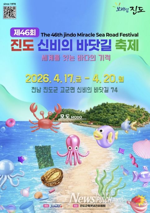 뉴스펀치 최영남 기자 | 진도군은 ‘세계를 잇는 바다의 기적’을 주제로 한 '제46회 진도 신비의 바닷길 축제'를 오는 17일부터 20일까지 4일간, 고군면 신비의 바닷길 일원에서 개최한다.