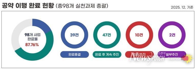 2025년 12월 말 기준 나주시는 총 98개 공약 사업 중 86개를 완료하거나 이행 후 추진해 87.76%의 이행률을 기록했으며 이는 전국 평균 70.42%보다 17.34%p, 전남 평균 68.27%보다도 크게 높은 수치다.