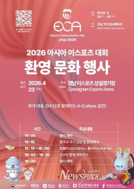 뉴스펀치 박세훈 기자 | 경상남도와 경남문화예술진흥원은 4월 24일 개막하는 ‘2026 아시아 이스포츠 대회’를 앞두고, 관람객 유입 확대를 위해 다양한 연계행사를 운영하며 본격적인 대회 분위기 조성에 나선다고 밝혔다.