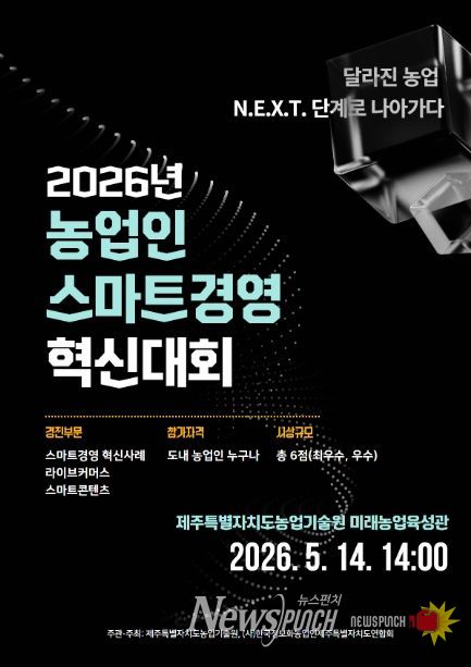 뉴스펀치 김용희 기자 | 제주특별자치도 농업기술원(원장 김태균)은 디지털 마케팅 등 정보화 우수사례를 발굴하고 농업·농촌 현장의 스마트화 확산을 위해 ‘2026년 농업인 스마트경영 혁신대회’ 참가자를 4월 30일까지 공개 모집한다.