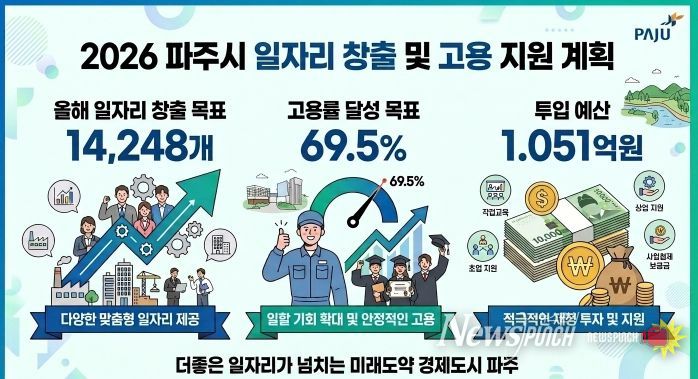 뉴스펀치 박상훈 기자 | 파주시는 2026년 ’일자리 1만 4,248개 창출‘과 ’고용률 69.5% 달성‘을 위해 1,051억 원의 예산을 투입하는 일자리 대책 세부계획을 수립·공시했다.