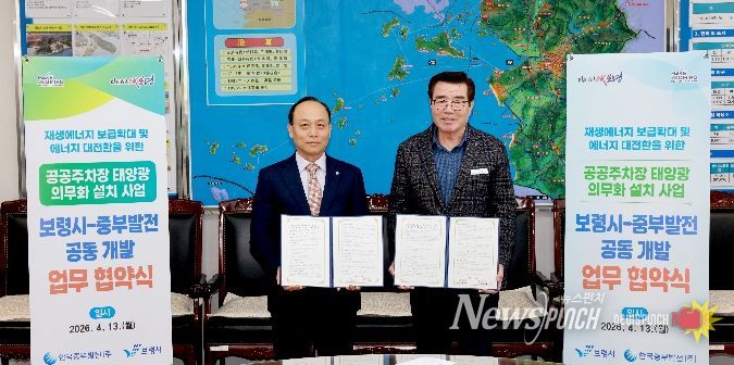 뉴스펀치 이현승 기자 | 보령시는 지난 13일 보령시청 시장실에서 한국중부발전과 ‘공공주차장 태양광 의무화 설치사업’ 공동개발을 위한 업무협약(MOU)을 체결했다고 밝혔다.