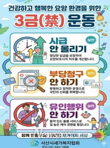 뉴스펀치 이현승 기자 | 서산시재가복지협회는 관내 장기요양기관의 운영 투명성을 높이고 질 높은 돌봄 서비스를 제공하기 위해‘3禁운동’을 본격적으로 전개한다고 밝혔다.