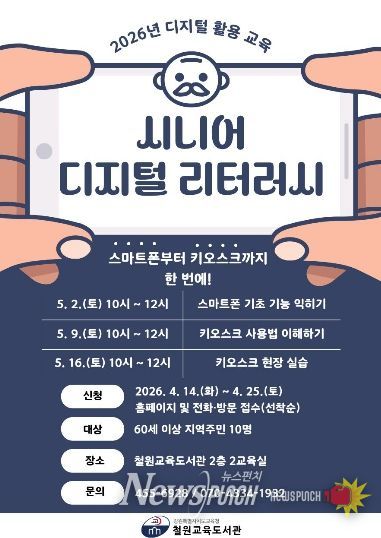 뉴스펀치 조평훈 기자 | 철원교육도서관(관장 김민서)은 5월 2일부터 16일까지 2교육실에서 60세 이상 지역주민 10명을 대상으로 ‘시니어 디지털 리터러시’ 프로그램을 운영한다.