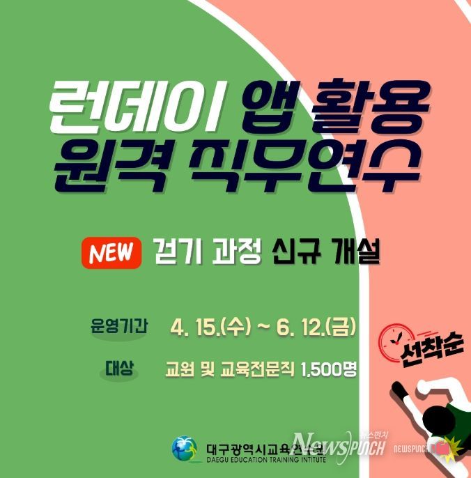 뉴스펀치 조평훈 기자 | 대구시교육청 산하 대구교육연수원은 4월 15일부터 교원 및 교육전문직 1,029명을 대상으로‘2026 런데이 앱 활용 원격 직무연수’1기를 운영한다.