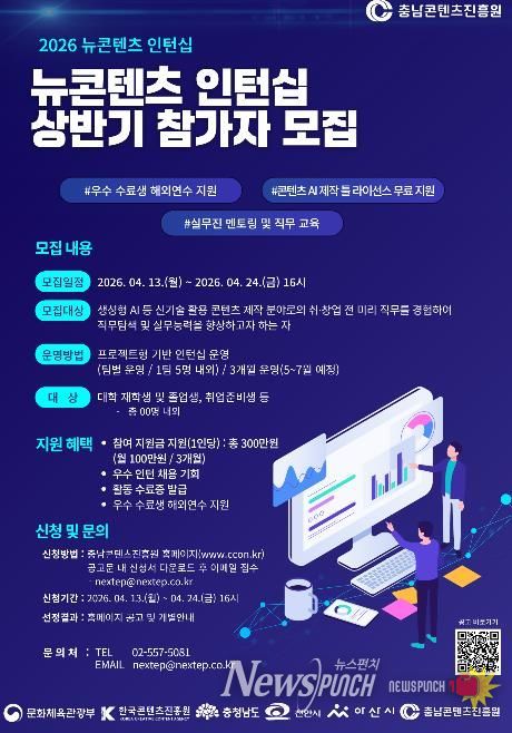 뉴스펀치 이현승 기자 | 충남콘텐츠진흥원은 도내 콘텐츠 산업 인재 양성과 일자리 창출을 위해 ‘2026 뉴콘텐츠 인턴십’ 상반기 참가자를 모집한다고 밝혔다.