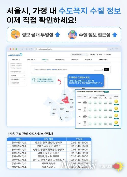 뉴스펀치 박상훈 기자 | 서울시는 시민이 거주하는 가정 내 수돗물 수질을 보다 정확하게 확인할 수 있도록 자치구별 아파트·다중이용시설 등 주택 유형별 100지점(자치구별 4지점)을 선정해 최초로 ‘가정내 수도꼭지 수질정보’를 서울아리수본부 누리집에 공개한다. 4월부터 매월 15일 정기적으로 공개해 수돗물 수질에 대한 시민 신뢰도를 한층 높일 계획이라고 밝혔다.