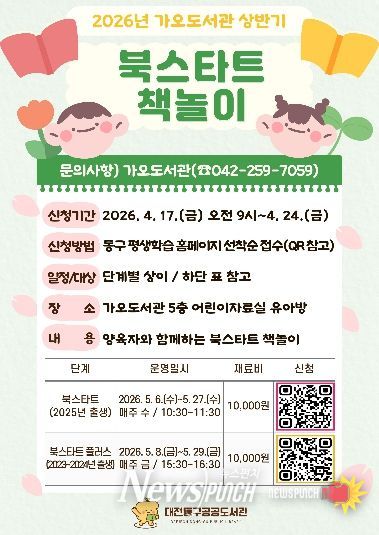 뉴스펀치 이현승 기자 | 대전 동구는 오는 5월 6일부터 29일까지 가오도서관에서 2026 상반기 ‘북스타트 책놀이’ 프로그램을 운영한다고 14일 밝혔다.