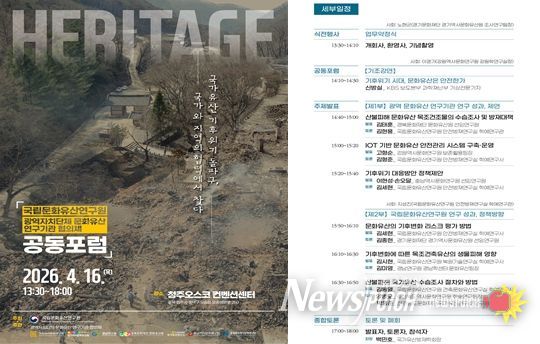뉴스펀치 조평훈 기자 | 국립문화유산연구원-광역자치단체 문화유산 연구기관 협의체(경기문화재단경기역사문화유산원, 경남연구원경남학연구센터, 경북문화재단문화유산원, 전라남도문화재단국가유산연구소, 충남역사문화연구원, 충청북도역사문화연구원)는 2026년 4월 16일 수요일 「국가유산 기후위기 돌파구, 국가와 지역의 협력에서 찾다」를 주제로 청주 오스코에서 공동 포럼을 개최한다.