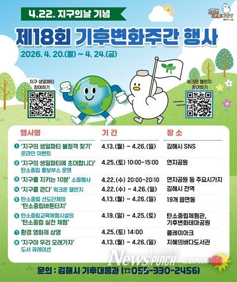 뉴스펀치 박세훈 기자 | 김해시는 제56주년 지구의 날(4.22)을 맞아 오는 20일부터 26일까지 ‘탄소중립 실천으로 세상을 잇다’라는 슬로건 아래 제18회 기후변화주간을 운영한다고 15일 밝혔다.