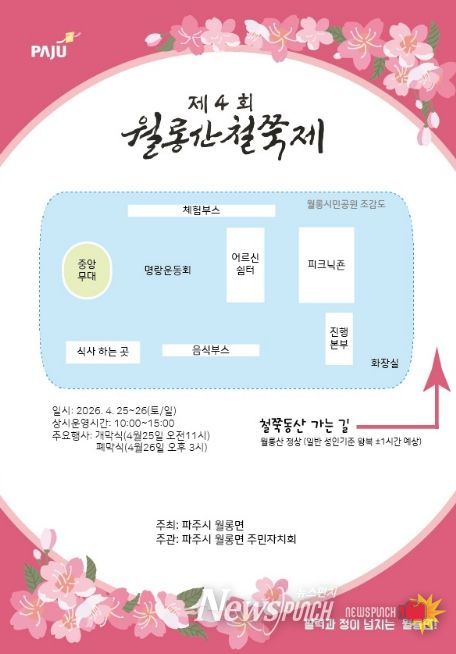 뉴스펀치 박상훈 기자 | 파주시 월롱면이 주최하고 월롱면 주민자치회가 주관하는 ‘제4회 월롱산 철쭉제’가 오는 4월 25일부터 26일까지 이틀간 월롱시민공원(월롱면 덕은리 산 134-1, 월롱배수지)에서 개최된다.