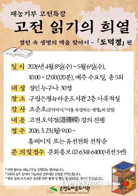 구립은평뉴타운도서관 관계자는 “이번 강좌를 통해 지역 주민들이 고전을 더 친숙하게 접하고, 삶을 돌아보는 의미 있는 시간을 보내길 바란다”고 말했다.