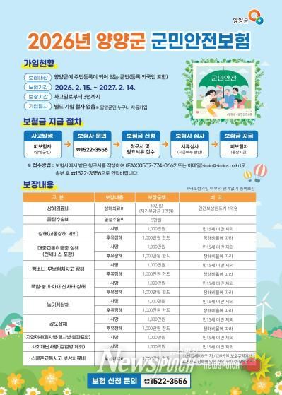 뉴스펀치 조평훈 기자 | 양양군이 예상치 못한 재난이나 사고로부터 군민을 보호하기 위해 ‘2026년 군민안전보험’을 갱신하고 보장 서비스를 이어간다고 밝혔다.