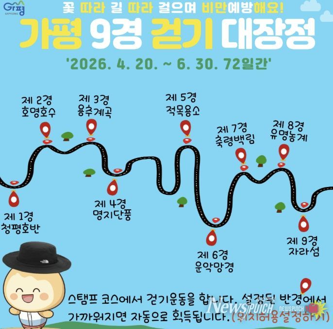 뉴스펀치 박상훈 기자 | 가평군의 수려한 자연경관을 배경으로 건강을 다지는 ‘2026 가평 9경 걷기 대장정’이 오는 20일부터 시작된다. 가평군보건소는 군민들의 비만을 예방하고 걷기 실천율을 높이기 위해 이번 프로그램을 마련했다고 15일 밝혔다.