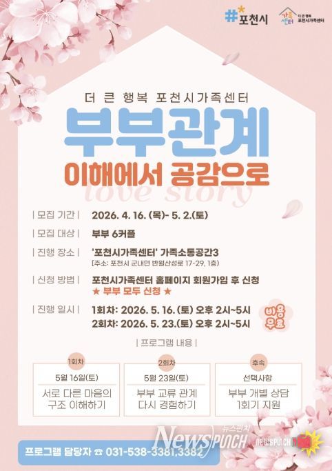뉴스펀치 박상훈 기자 | 포천시 직영 더 큰 행복 포천시가족센터는 건강한 부부 관계 형성과 가족 기능 강화를 위해 부부 대상 프로그램 ‘부부 관계 이해에서 공감으로’ 참여자를 모집한다.