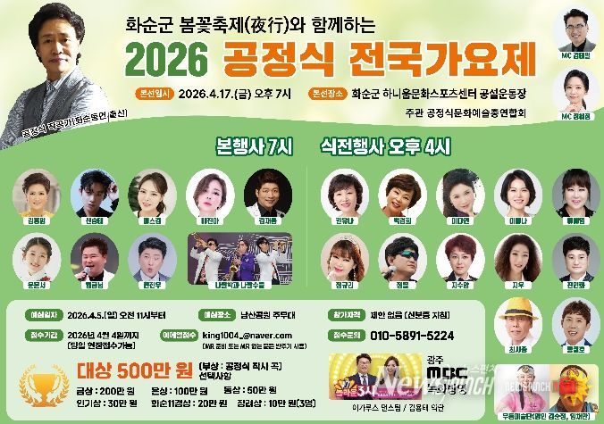 뉴스펀치 김용희 기자 | 화순군은 오는 4월 17일 16시부터 ‘2026 화순 공정식 전국 가요제’를 화순 공설운동장 특설무대에서 개최한다고 밝혔다.