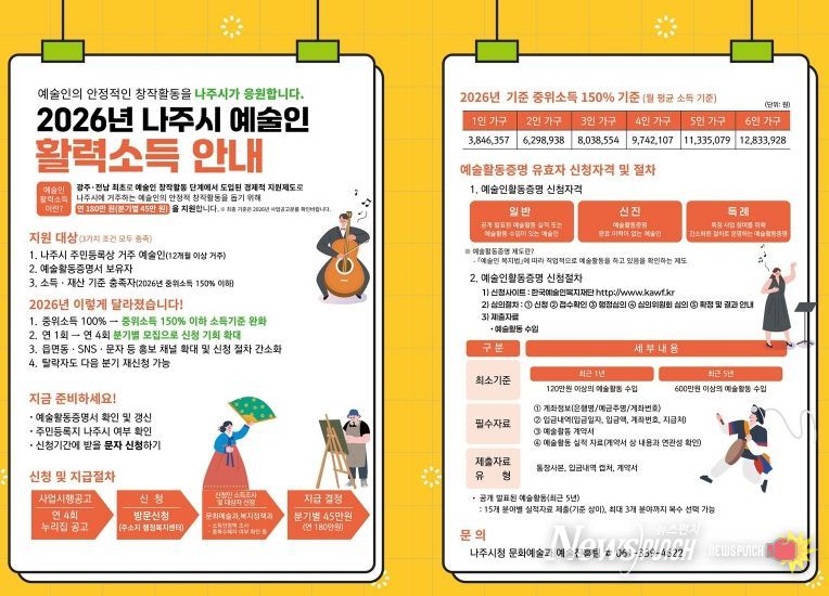 뉴스펀치 김용희 기자 | 전남 나주시가 지속 가능한 문화예술 생태계 조성을 위해 ‘2026년 2분기 예술인 활력소득 지원금’ 신청을 오는 5월 19일까지 접수한다.