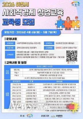 뉴스펀치 박상훈 기자 | 이천시가 지난 4월 6일부터 5월 7일까지 사회적경제에 관심 있는 이천시민 예비창업자 30명을 2026년 이천시 사회적경제 창업교육생으로 모집한다고 밝혔다.