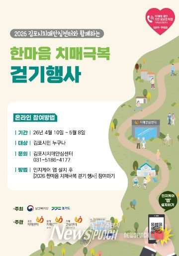 참여를 원하는 김포시민은 스마트폰 애플리케이션에서 ‘인지케어’앱을 설치한 뒤 활동 메뉴의 『2026 한마음 치매 극복 걷기 행사』를 선택하고 ‘참여하기’를 누르면 된다.