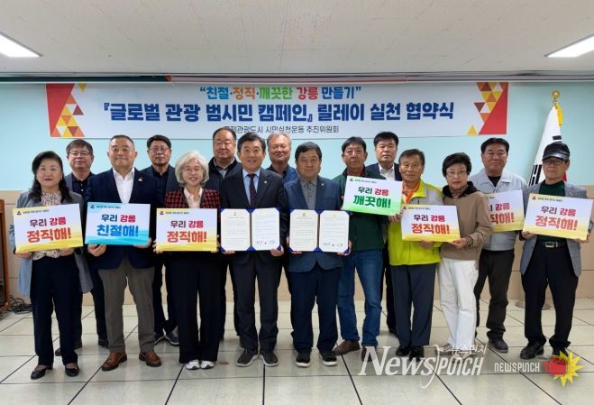 뉴스펀치 조평훈 기자 | 국제관광도시 시민실천운동 추진위원회와 바르게살기운동 강릉시협의회(회장 구남오)는 15일 친절‧정직‧깨끗한 강릉 만들기 글로벌 관광 범시민 캠페인 릴레이 실천 협약을 체결했다.
