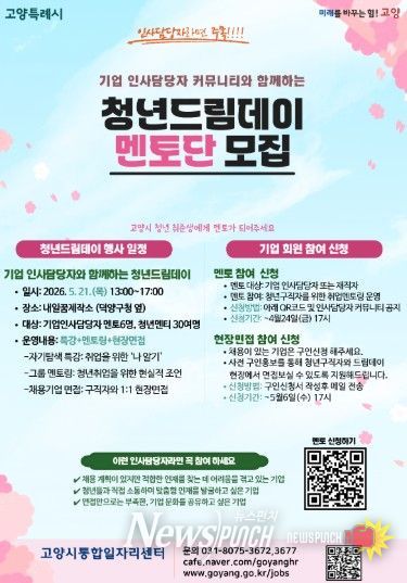 뉴스펀치 박상훈 기자 | 고양특례시는 청년들의 취업 경쟁력 강화를 위한 프로그램 ‘청년드림데이’개최를 앞두고, 기업 인사담당자를 대상으로 한 일자리 멘토단을 모집한다.