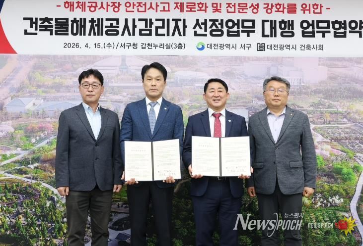 뉴스펀치 이현승 기자 | 대전 서구는 15일 구청 갑천누리실에서 대전광역시건축사회와 ‘해체공사장 안전사고 제로화 및 전문성 강화를 위한 건축물 해체 공사 감리자 선정 업무 대행 업무협약’을 체결했다.