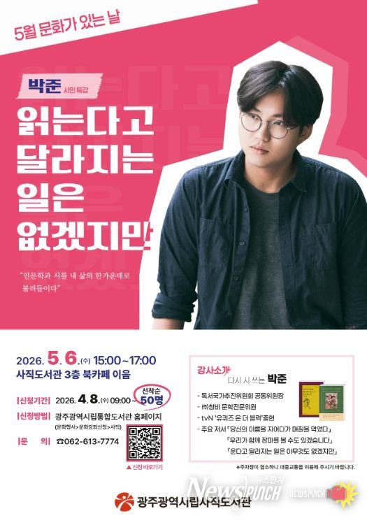 뉴스펀치 김용희 기자 | 광주광역시 사직도서관은 5월 ‘문화가 있는 날’을 맞아 오는 5월 6일 북카페 이음에서 ‘박준 시인 초청 특별강연’을 연다.