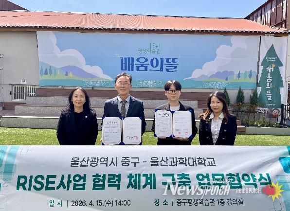 뉴스펀치 김윤걸 기자 | 울산 중구와 울산과학대학교 RISE사업단이 4월 15일 오후 2시 중구평생학습관 배움의 뜰 강의실에서 ‘RISE사업 평생교육 협력체계 구축’ 업무협약을 체결했다.