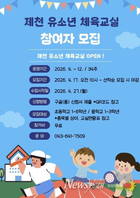 뉴스펀치 이현승 기자 | 제천시체육회는 지역 유소년의 체육활동 참여 확대와 체력 증진을 위해 ‘제천 유소년 체육교실’을 오는 4월 27일부터 운영한다고 밝혔다.
