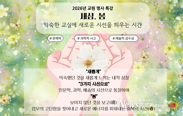 뉴스펀치 김윤걸 기자 | 부산광역시교육청교육연수원은 오는 21일부터 6월 2일까지 3회에 걸쳐 연수원 대강당에서 교원 및 교육전문직원 400여 명을 대상으로 2026 명사 초청 특강 ‘새삼 봄’을 운영한다.
