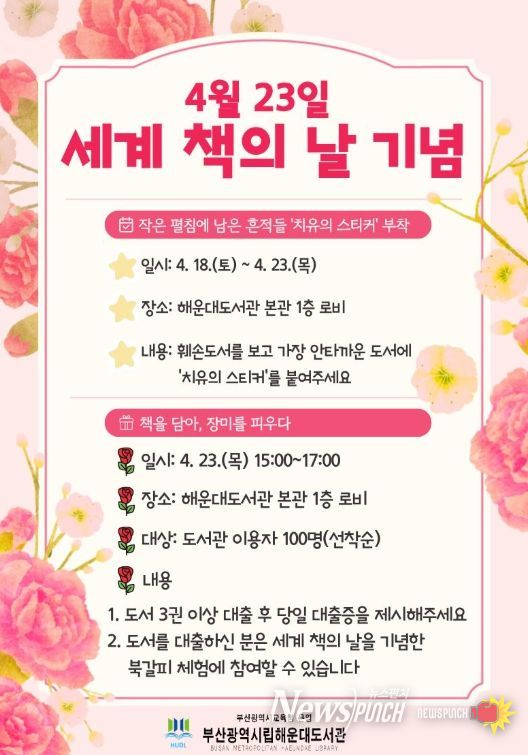 뉴스펀치 김윤걸 기자 | 부산광역시립해운대도서관은 오는 18일부터 23일까지 도서관 본관 로비에서 도서관 이용자를 대상으로 ‘세계 책의 날(4월 23) 기념 프로그램’을 운영한다.