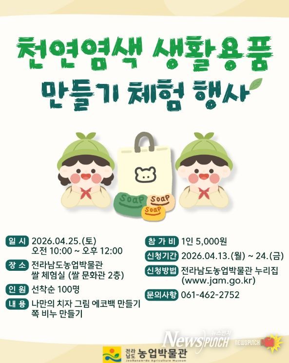 최병남 전남도농업박물관장 직무대리는 “전통의 색이 주는 따스함을 가족이 함께 느껴보길 바라는 마음으로 행사를 기획했다”며 “직접 만든 천연염색 소품을 통해 일상에서 농경문화의 가치를 새롭게 발견하는 즐거운 시간이 되길 기대한다”고 말했다.