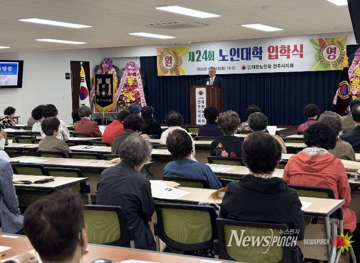 뉴스펀치 정홍균 기자 | 대한노인회 전주시지회(지회장 홍성언)는 16일 지회 강당에서 노인들의 배움과 사회참여 기회를 확대하기 위한 ‘제24회 노인대학 입학식’을 개최했다.