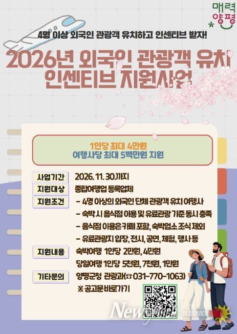 뉴스펀치 박상훈 기자 | 양평군은 외국인 관광객 유치를 촉진하고 침체된 지역 관광산업에 활력을 불어넣기 위해 ‘2026년 양평군 외국인 관광객 유치 인센티브 지원사업’을 추진한다고 밝혔다.