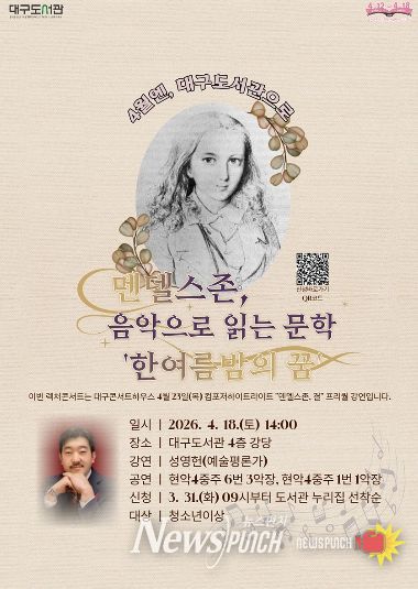 뉴스펀치 조평훈 기자 | 대구도서관은 4월 도서관 주간을 맞아 대구콘서트하우스와 협업해 특별 렉처콘서트 ‘멘델스존 음악으로 읽는 문학’을 4월 18일 오후 2시에 개최한다.