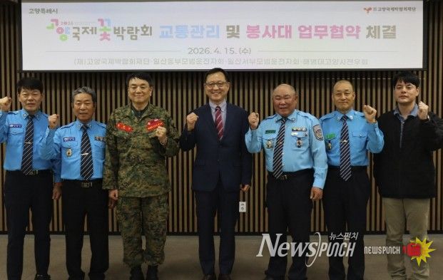뉴스펀치 박상훈 기자 | (재)고양국제박람회재단이 지난 15일 일산동·서부모범운전자회, 해병대고양시전우회와 함께 일산호수공원 고양꽃전시관에서‘2026고양국제꽃박람회 교통관리를 위한 업무협약’을 체결했다.