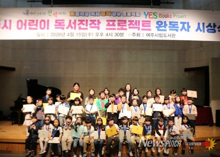 뉴스펀치 박상훈 기자 | 여주시 평생교육과 여주시립도서관은 지난 4월 15일, 여주도서관 여강홀에서 '2026년 상반기 여주시 어린이 독서진작 프로젝트 완독 시상식'을 개최했다. 이번 시상식은 프로젝트를 끝까지 완수한 어린이 62명의 노력을 격려하고 축하하기 위해 마련됐다.