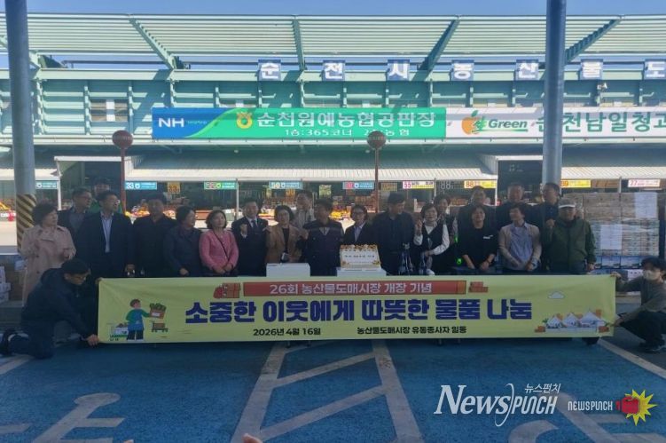 뉴스펀치 김용희 기자 | 순천시농산물도매시장은 16일 개장 26주년(개장일 2001년 4월 18일)을 맞아 기념행사 대신 지역사회를 위한 따뜻한 나눔 활동을 펼쳤다.