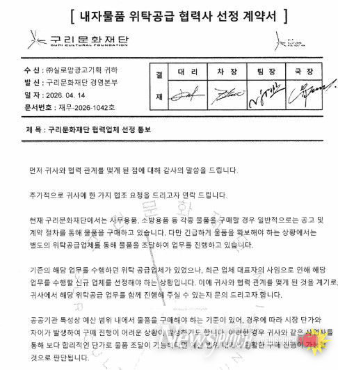 재단은 ‘내자물품 위탁공급 협력사 선정 계약서’ 등 실제 공문과 유사한 형식의 문서를 활용해 협력업체 선정을 통보하고, 물품 대리구매 등을 유도하는 사례가 확인됐다고 밝혔다.
