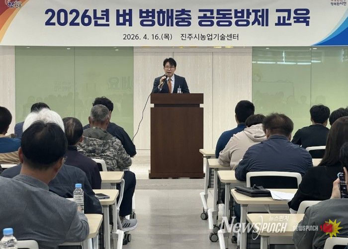 뉴스펀치 박세훈 기자 | 진주시는 16일 오후 농업기술센터에서 벼 병해충 피해를 최소화하고 체계적인 공동방제를 추진하기 위해 ‘2026년 벼 병해충 공동방제 교육’을 실시했다고 밝혔다.