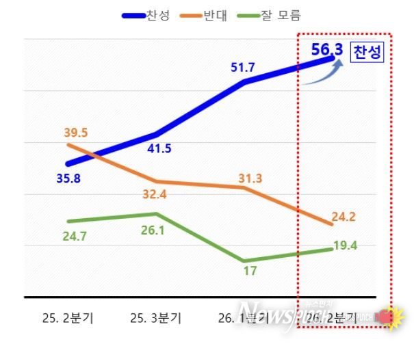 수원 군공항 이전에 대한 화성시민 찬성 비율은 꾸준히 상승하고 있다. 언론사 여론조사 결과에 따르면 ‘찬성’ 비율은 2025년 6월 35.8%, 9월 41.5%, 2026년 1월 51.7%, 4월 56.3%였다. 이번 조사에서는 찬성, 반대 격차가 32.1%까지 벌어졌다.