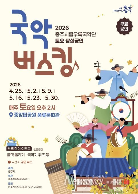 충주시립우륵국악단은 오는 4월 25일부터 5월 30일까지 매주 토요일 오후 2시, 중앙탑면 풍류문화관에서 2026 상반기 토요상설 공연인 ‘국악버스킹’을 개최한다고 밝혔다.