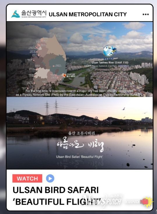 뉴스펀치 김윤걸 기자 | 울산시는 ‘울산 조류사파리’홍보영상이 국제철새기구 공식관계망(채널)을 통해 전 세계에 소개되며 세계적(글로벌) 생태도시 울산 알리기가 본격 시작됐다고 밝혔다.