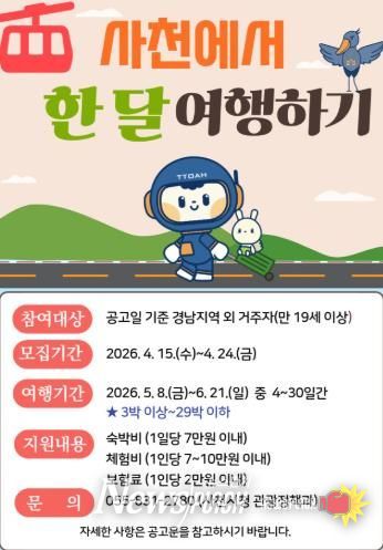 뉴스펀치 박세훈 기자 | 사천시는 체류형 관광 활성화와 지역 관광자원 홍보를 위해 ‘사천에서 한 달 여행하기’ 1차 참가자를 4월 15일부터 4월 24일까지 모집한다.