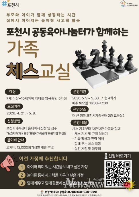 뉴스펀치 박상훈 기자 | 포천시 더 큰 행복 포천시가족센터는 공동육아나눔터 상시 프로그램의 일환으로 아동의 논리적 사고력 향상과 부모-자녀 간 긍정적 상호작용을 지원하기 위해 가족 참여형 체스 프로그램 '가족 체스 교실'을 운영한다고 밝혔다.