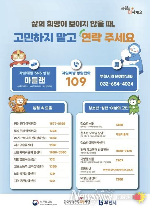 송정원 부천시보건소장은 “힘든 순간일수록 혼자 견디려 하지 말고 반드시 도움을 요청해야 한다”며 “주변의 작은 관심과 한 번의 연락이 소중한 생명을 지킬 수 있다”고 강조했다.