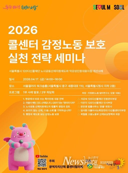서울특별시 120다산콜재단은 4월 17일 서울갤러리(서울시청 지하1층)에서 광역자치단체 콜센터협의체가 주최하고 서울특별시 120다산콜재단과 노동‧일터연구소 ‘감동’이 공동 주관하는'2026 콜센터 감정노동 보호 실천 전략 세미나'를 개최했다고 밝혔다.