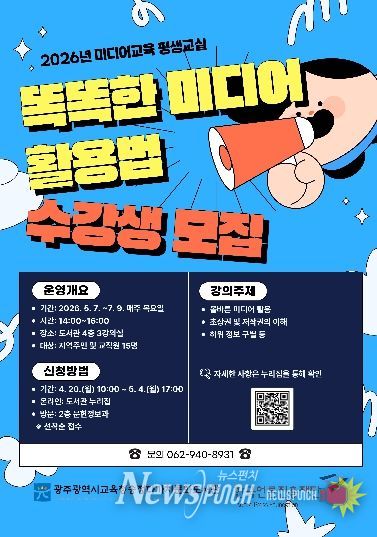 뉴스펀치 최영남 기자 | 광주시교육청송정다가치문화도서관은 오는 5월 7일부터 7월 9일까지 ‘2026년 미디어교육 평생교실’을 운영한다.
