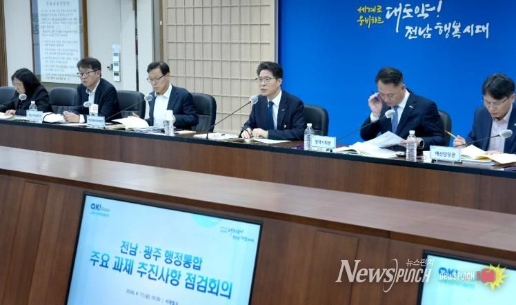 뉴스펀치 김용희 기자 | 전라남도는 17일 도청 서재필실에서 전남·광주 행정통합 주요 과제 추진상항 점검회의를 열어 오는 7월 1일 출범하는 전남광주통합특별시의 성공적 탄생에 총력을 기울이기로 했다.